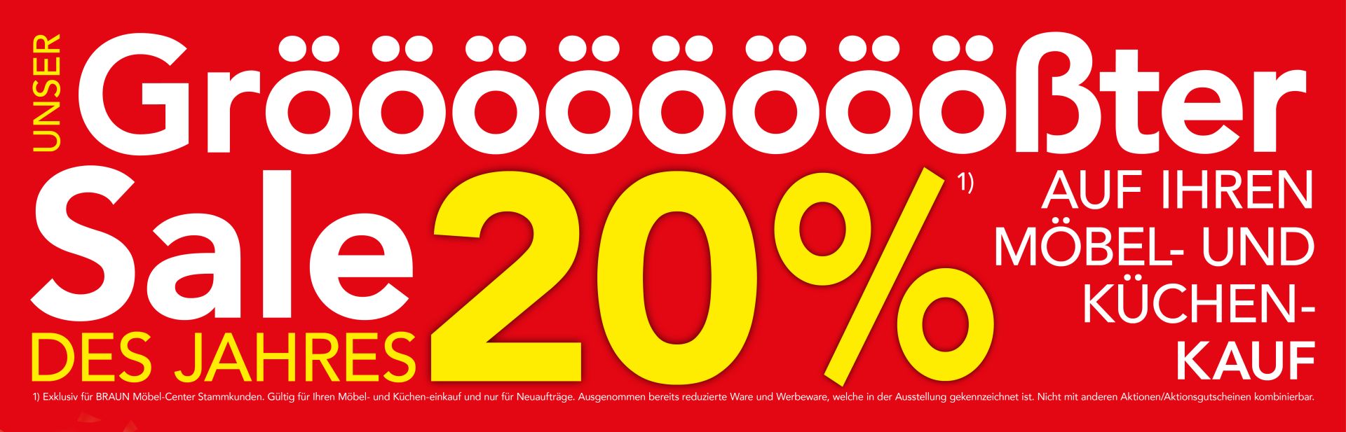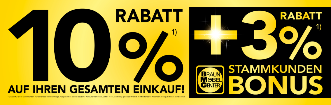 *) Exklusiv für BRAUN Möbel-Center Stammkunden. Gültig für Ihren Möbel- und Kücheneinkauf und nur für Neuaufträge. Basis für den Rabatt ist der ausgewiesene BMC-Listenpreis. Auch gültig für Elektrogeräte und Küchenzubehör in Verbindung mit einem Küchenkauf. Ausgenommen bereits reduzierte Ware und Werbeware, welche in der Ausstellung gekennzeichnet ist, sowie Stein- & Keramikarbeitsplatten. Nur kombinierbar mit andern Jubiläums-Rabatten.