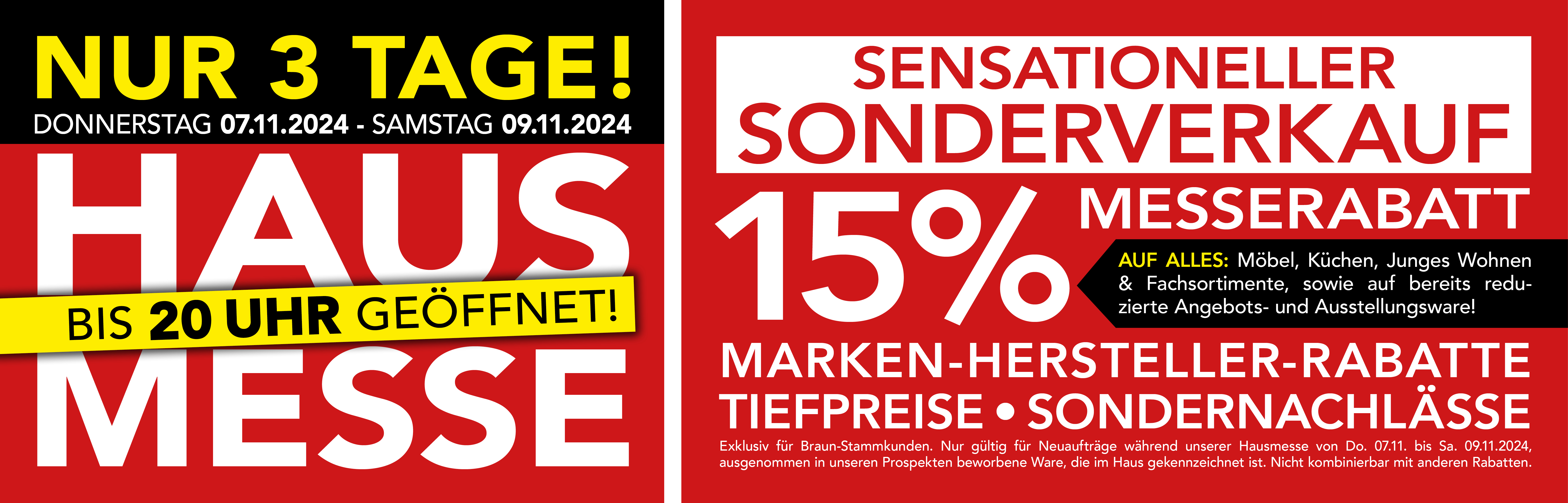 *Exklusiv für BRAUN Möbel-Center Stammkunden. Gültig für Ihren Möbel- und Kücheneinkauf und nur für Neuaufträge. Basis für den Rabatt ist der ausgewiesene BMC-Listenpreis. Auch gültig für Elektrogeräte und Küchenzubehör in Verbindung mit einem Küchenkauf. Ausgenommen bereits reduzierte Ware und Werbeware, welche in der Ausstellung gekennzeichnet ist, sowie Stein- & Keramikarbeitsplatten. Nur kombinierbar mit anderen Hausmesse-Rabatten.