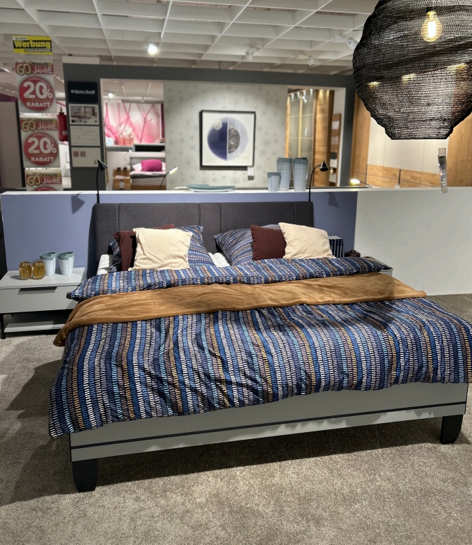 Bett: Dekor hellgrau / Graphit, Bettrahmen 180x200 cm, Komforthöhe, Polsterkopfteil Grau,
