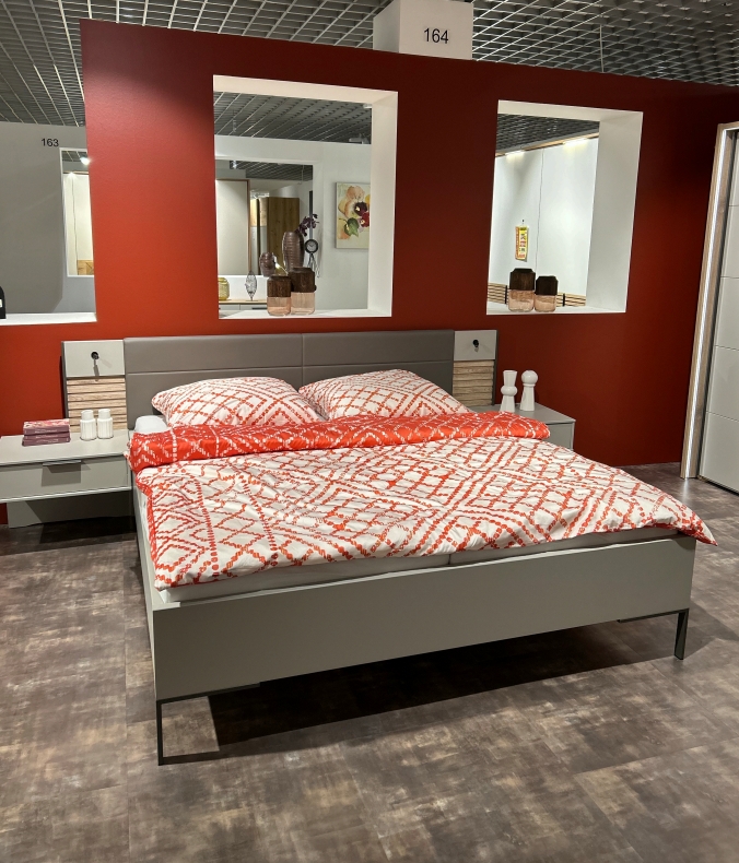 Bettanlage: Ausf. Kieselgrau Dekor, Polsterkopfteil in Kunstleder, schmale Winkelfüße in schiefer