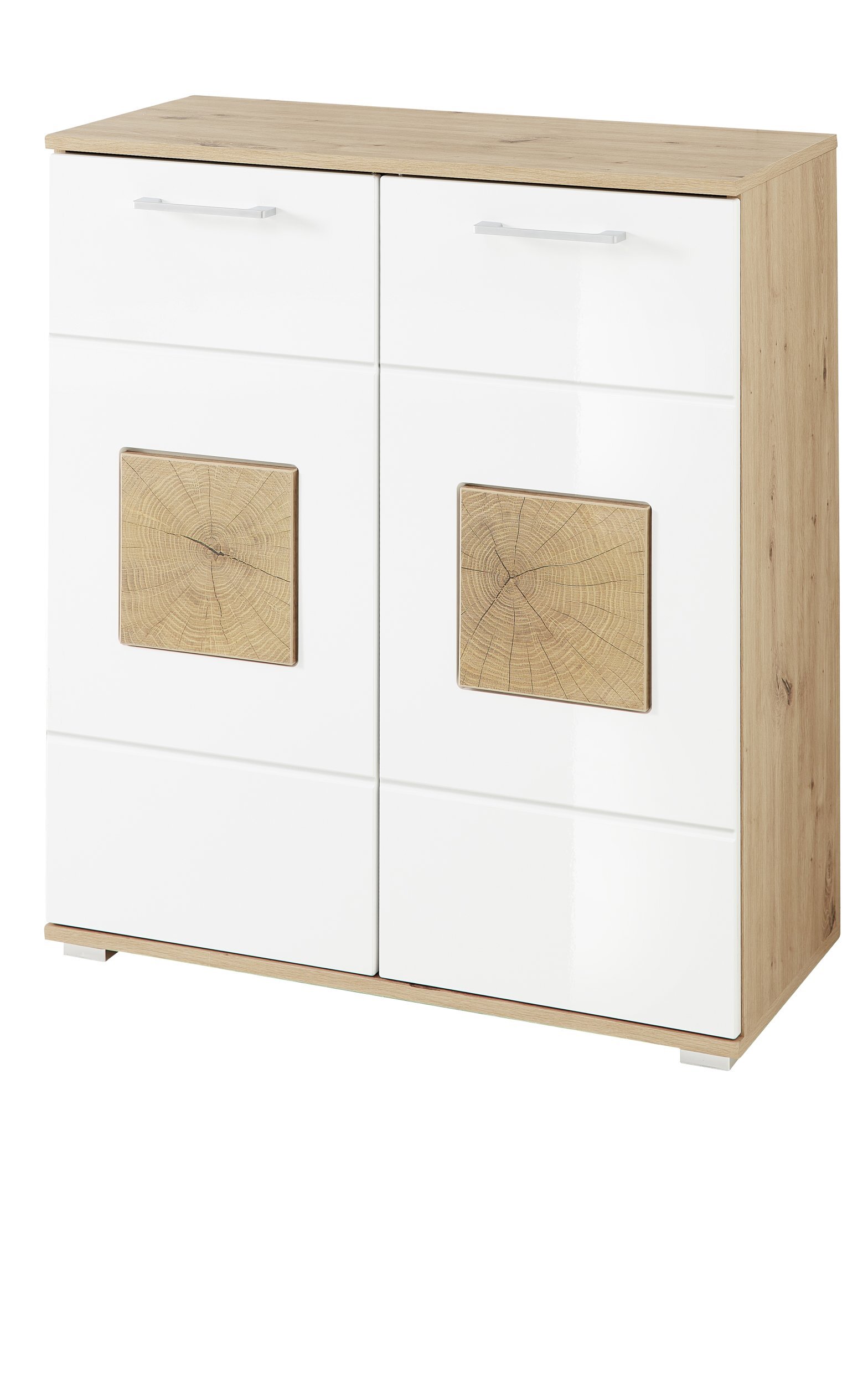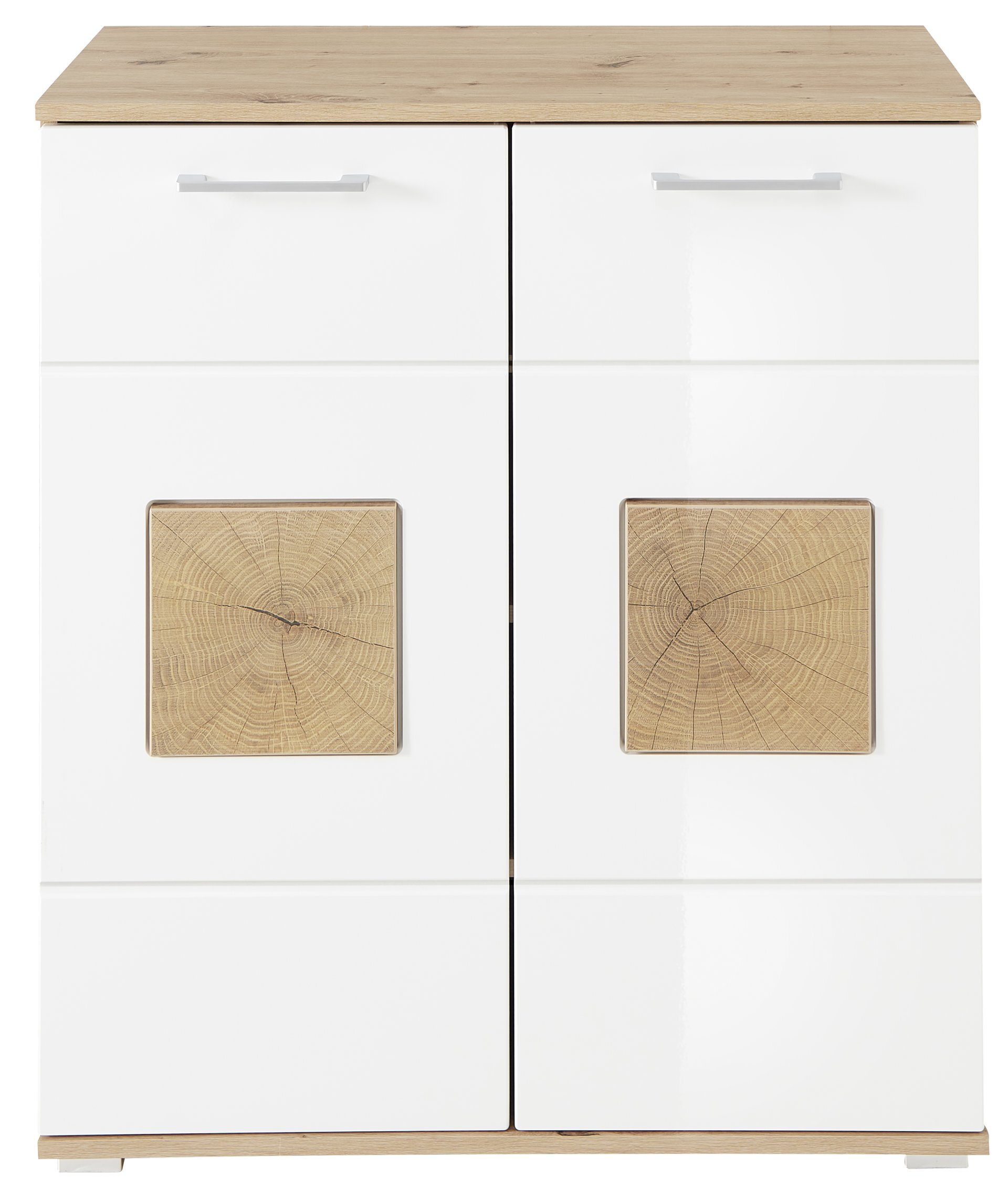 - Lieferantenfarbe Korpus: Artisan Eiche Nachbildung Front: weiß Hochglanz MDF / Absetzung Hirnholz Nachbildung