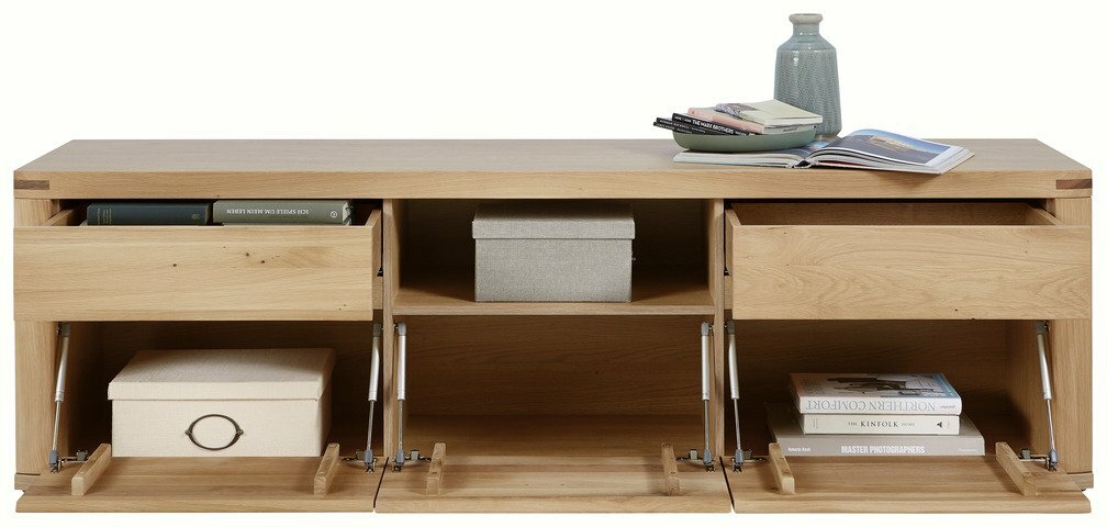 3 Klappen unten, 2 Schubkästen oben+offenes Fach